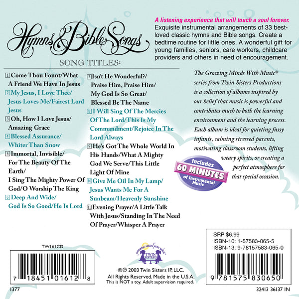 A listening experience that will touch a soul forever. Exquisite instrumental arrangements of 33 best-loved classic hymns and Bible songs. Create a bedtime routine for little ones. A wonderful gift for young families, seniors, care workers, childcare providers, and others in need of encouragement. The Growing Minds with Music series from Twin Sisters Productions is a collection of albums inspired by our belief that music is powerful and contributes much to both the learning environment and the learning process. Each album is ideal for quieting fussy infants, calming stressed parents, motivating classroom students, lifting weary spirits, or creating a perfect atmosphere for that special occasion.